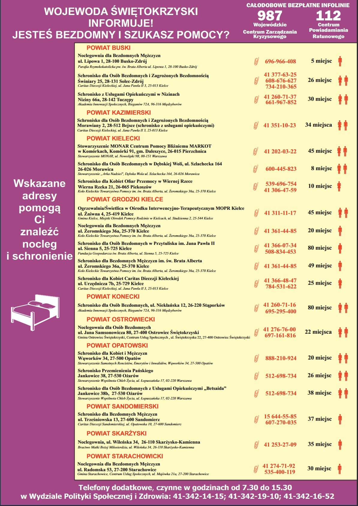 Wojewoda Świętokrzyski informuje! Jesteś bezdomny i szukasz pomocy?0Opublikowano: 20 listopada 202520 listopada 2025Utworzył: m.r.Kategoria: Aktualności Wskazane adresy pomogą Ci znaleźć nocleg i schronienie